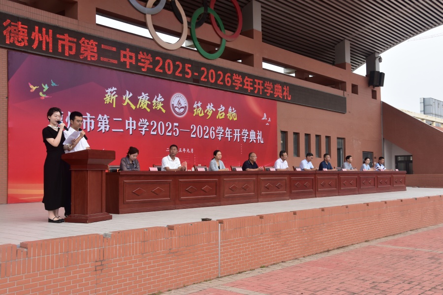 秋九月,惠风和畅。德州二中2025-2026学年开学典礼在学校运动场举行,全校师生参加学校领导班子成员和师生代表在主席台就座。优秀青年教师张朝、杨洋老师主持。