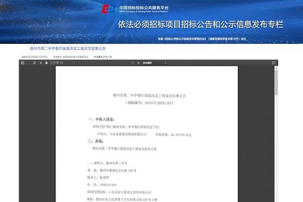德州市第二中学餐厅屋面改造工程成交结果公告